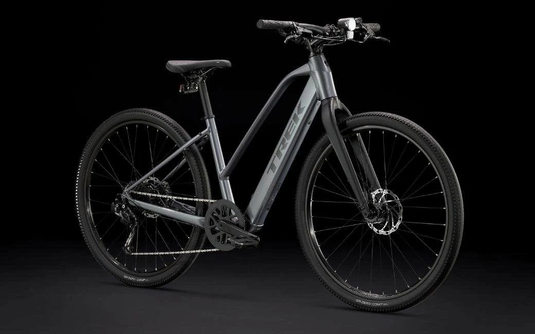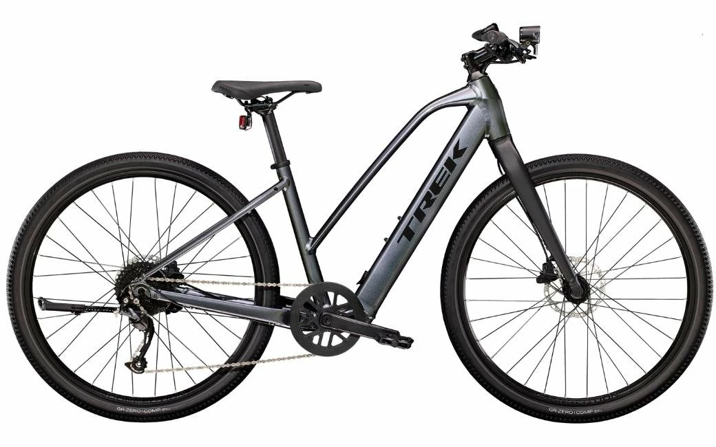 Un cadre ouvert léger en aluminium qui permet de monter et descendre facilement du vélo, le système d’assistance au pédalage exclusif de Trek doté d’un moteur-moyeu (250 W, 40 Nm) offrant une assistance allant jusqu’à 25 km/h et une batterie de 250 Wh pour une autonomie sur une distance allant jusqu’à 55 kilomètres par charge. Ses roues rigides 650b et ses pneus larges 50c offrent plus de performance et de confort sur les terrains variés. Il est aussi doté d’une transmission fiable Shimano à 9 vitesses, de freins à disque hydrauliques, d’éclairages intégrés alimentés par la batterie, et d’une béquille.